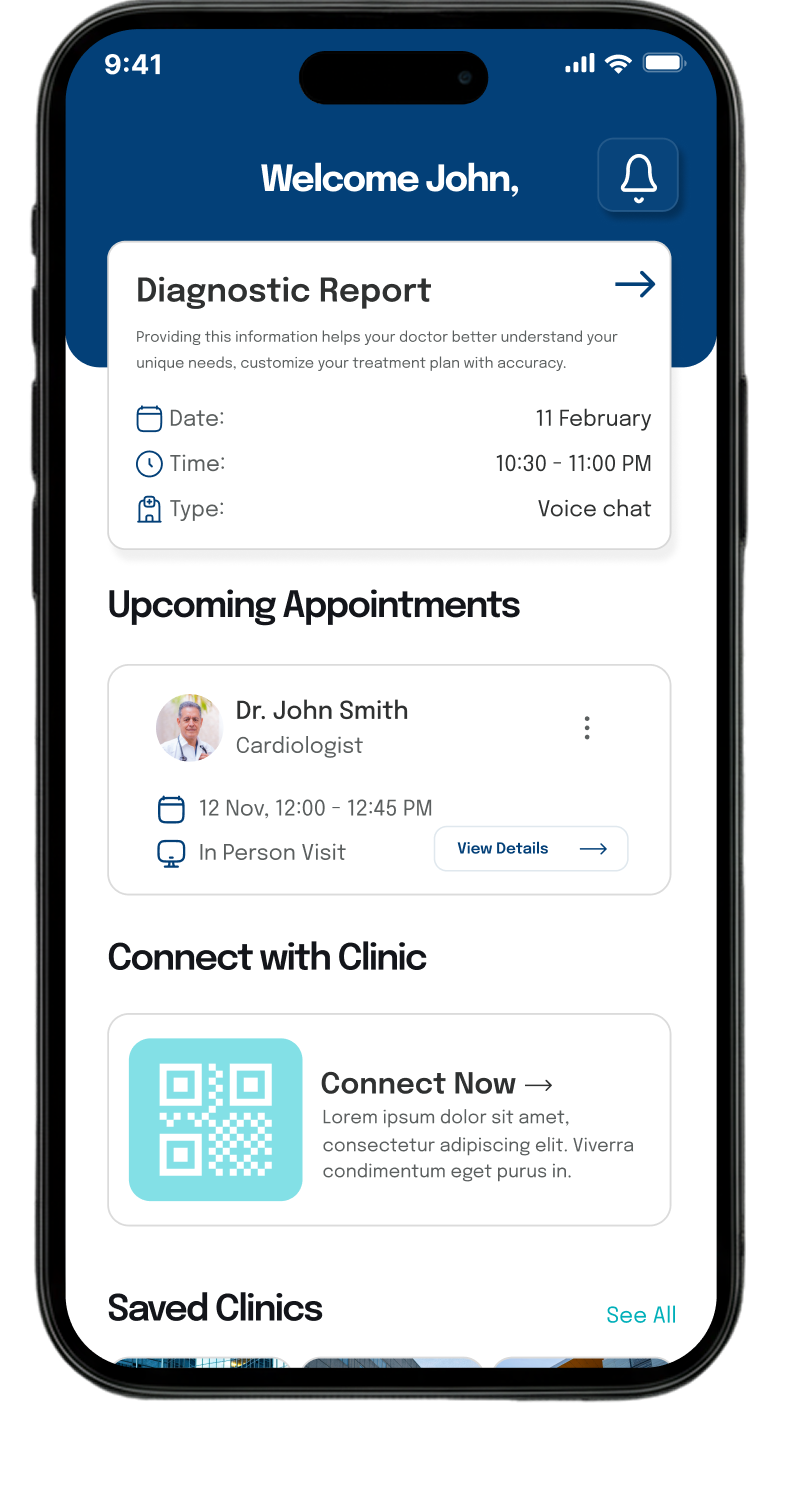 Track your health from anywhere. AI analyzes your symptoms, your doctor reviews the reports, and you stay connected to your clinic, all from your phone. Quality healthcare that fits your life, not the other way around.